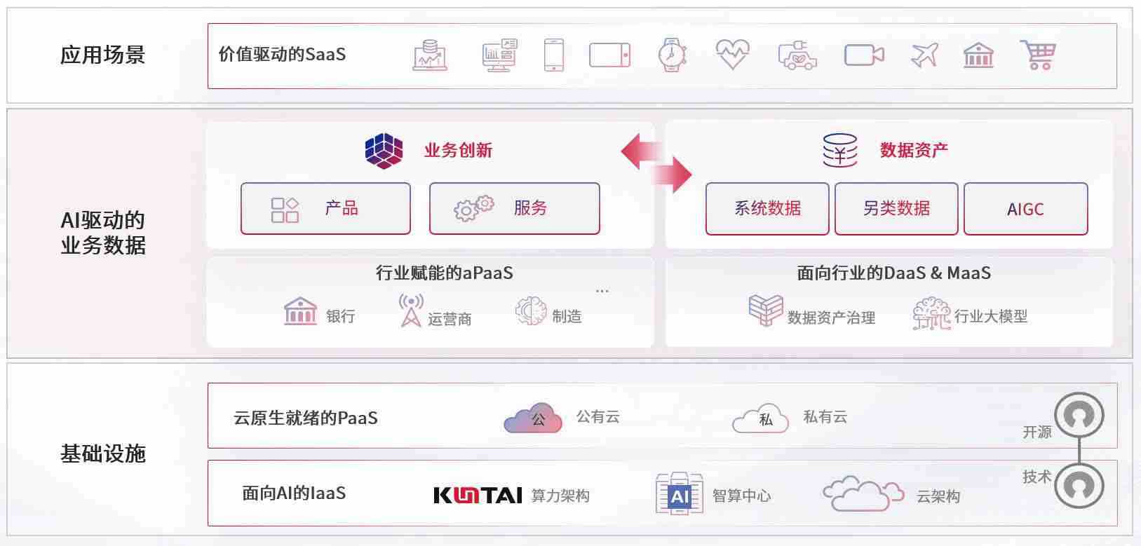 数字时代,,围绕企业数字化转型的关键要素,,,,bv伟德国际1946数码开创性的提出数云融合战略和技术体系框架,,着力在云原生、、、、数字原生、、、、AI原生和信创产业上架构产品和服务能力,,为处在不同数字化转型阶段的快消零售、、、、汽车、、、、金融、、、医疗、、政企、、、教育、、运营商等行业客户提供泛在的敏捷IT能力和融合的数据驱动能力,,,,构建跨界融合创新的数字业务场景和新业务模式,,,,助力企业级客户建立面向未来的核心能力和竞争优势,,全面推动社会的数字化、、、、智能化转型升级。。。