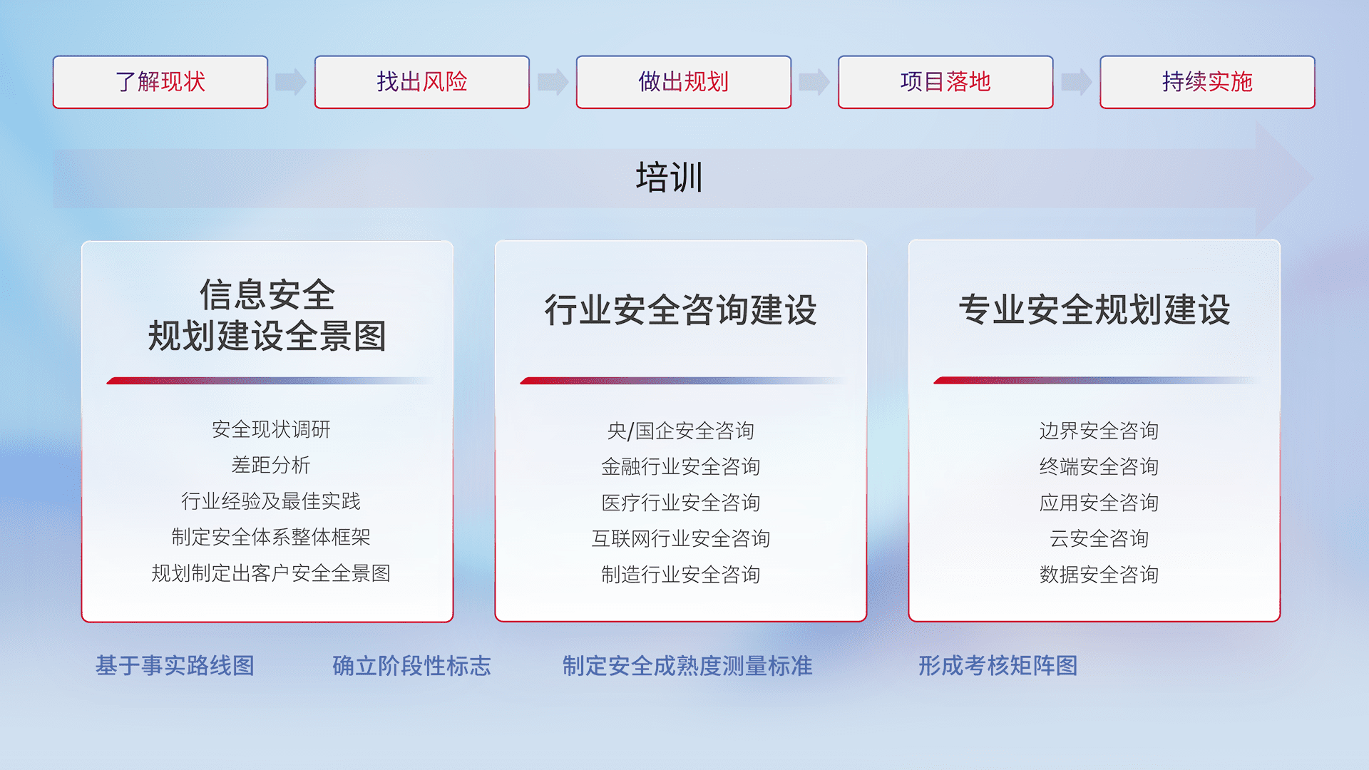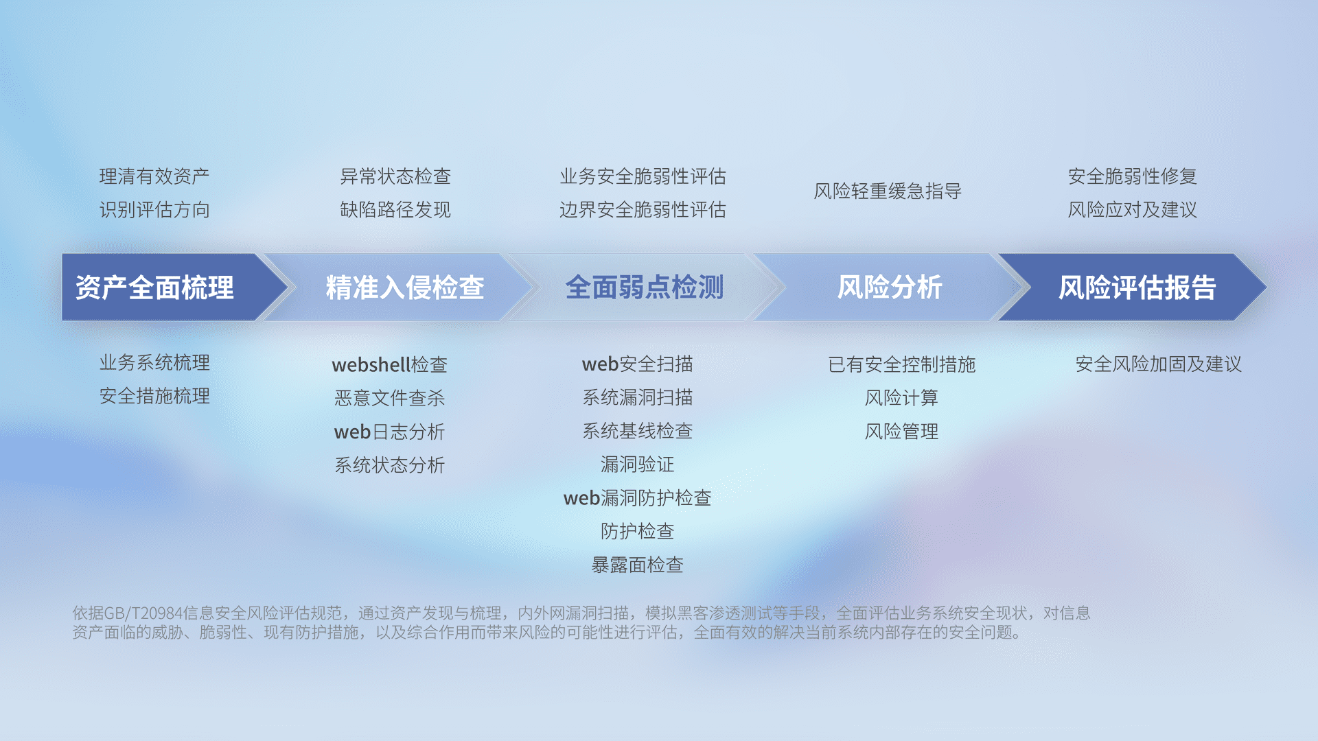 针对客户行业特性,,,以专业的安全服务+多厂商联合解决方案提供专属的一站式安全管理服务,,,帮助客户全面感知网络空间威胁,,基于识别、、、检测、、分析、、防护、、、、监测、、、响应的服务理论模型,,,从方案咨询、、、集成交付、、评估验证、、优化加固、、运维运营,,,,致力于为客户提供完整的闭环管理式安全服务。。。。以实战经验为客户打造高抵御风险的安全体系,,,帮助客户发现威胁、、、、对抗威胁、、处置威胁,,,,不断积累安全对抗能力,,,持续保障数字化安全。。。。