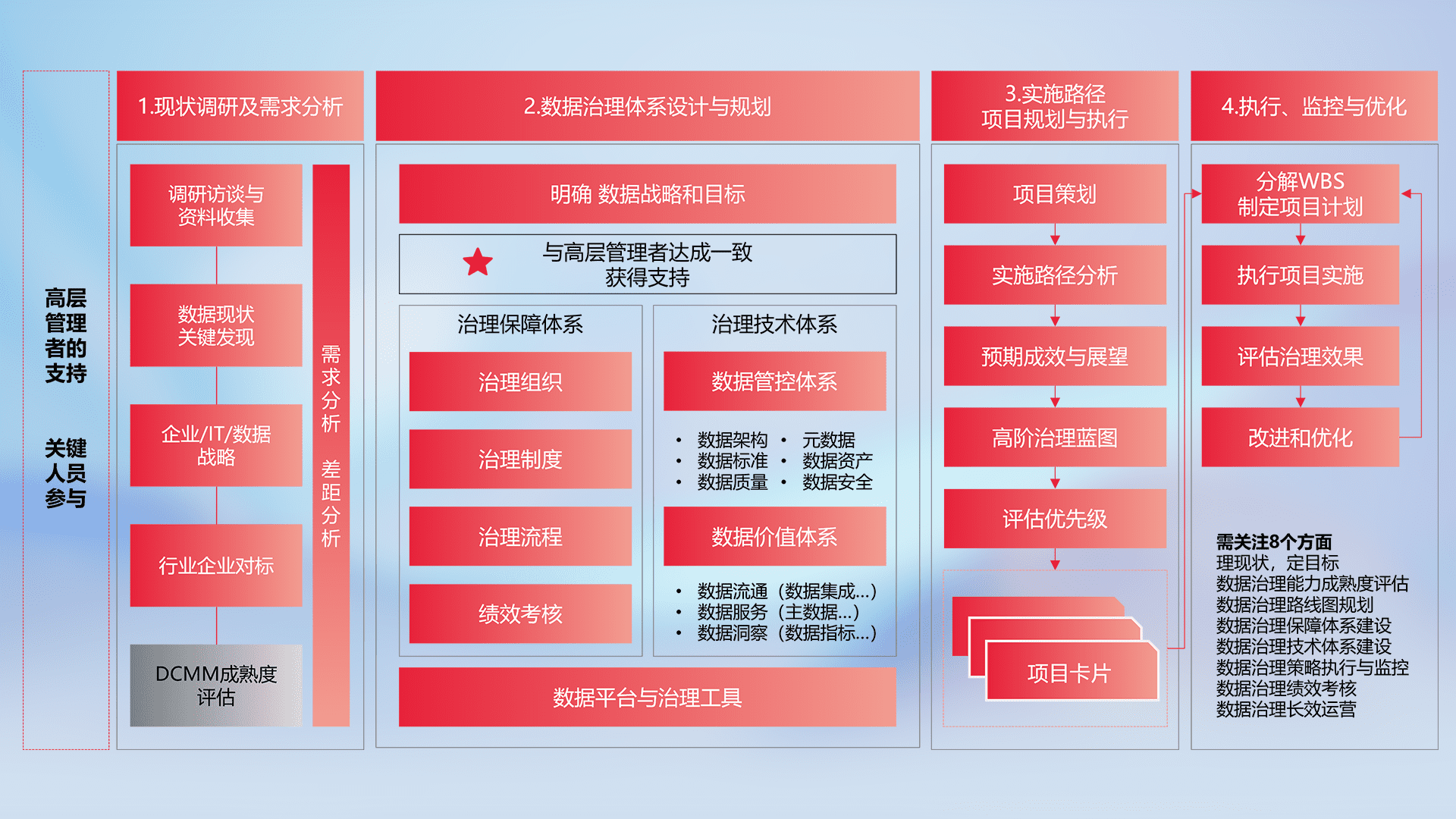 制定并执行统一的数据标准,,,,规范数据定义和格式,,,消除冗余和不一致性,,,,实现跨部门和跨系统的数据一致性,,为企业提供标准化的数据基础。。